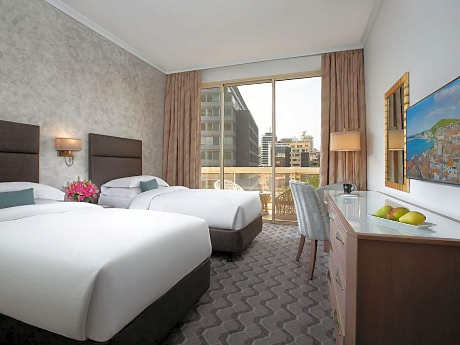 Well-sprung twin beds in the 35 sqm bedroom overlooking the beautiful city of Beirut. It offers access to the Club Lounge during the whole stay along with 24 hours stay, complimentary airport pick up or drop off, 2 pieces of laundry per day, daily refreshment at the Club Lounge from 10:30 until 18:00, and 3 complimentary premium beverages at Moodz Lounge and Bar during happy hours.