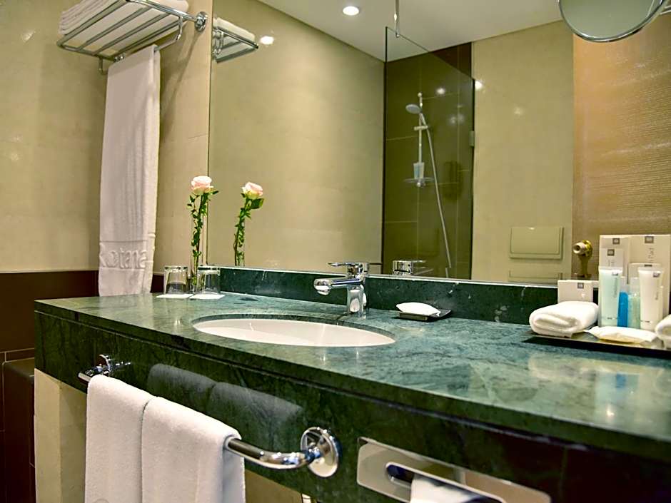 80 sqm king sized high floor bedroom with a living room overlooking the city. It has 2 bathrooms, one of them is equipped with Jacuzzi. Kitchenette is also available in one unit. The suite is equipped with an AC, phone, multilingual satellite, LCD TV, a private safe deposit box, tea and coffee making facilities and Wireless internet connection. All suites have free access to the Club Rotana Lounge in addition to Club Rotana amenities.