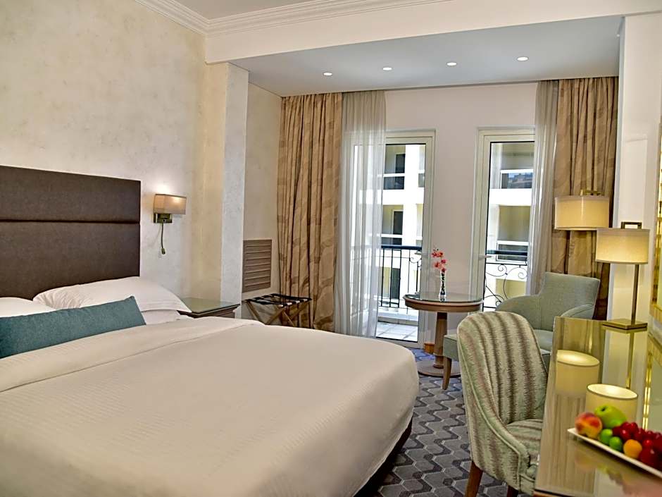 This 52 sqm king sized room is located on an upper floor where Mediterranean views persist. It offers access to the Club Lounge during the whole stay and grants complimentary airport pick up or drop off, 24 hours stay, daily refreshment at the Club Lounge from 10:30 until 18:00, 3 complimentary premium beverages at Moodz Lounge and Bar during happy hours & 2 pieces of laundry per day.