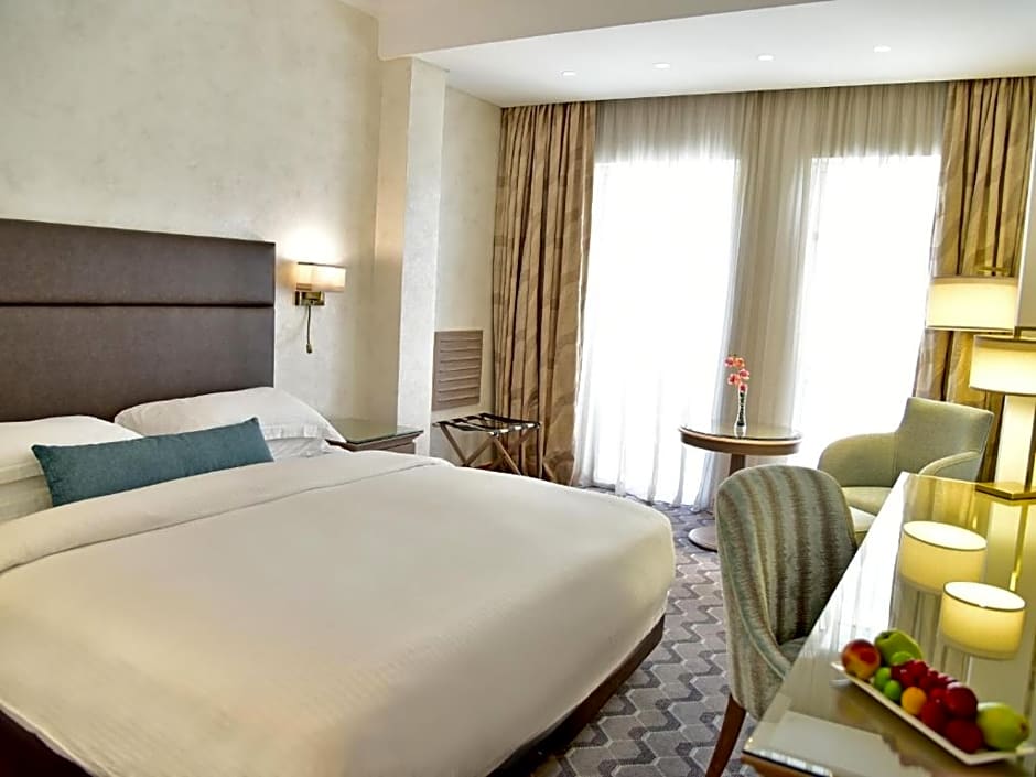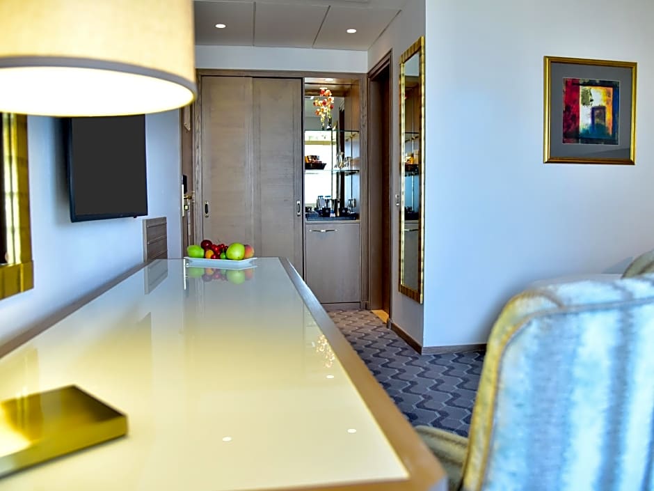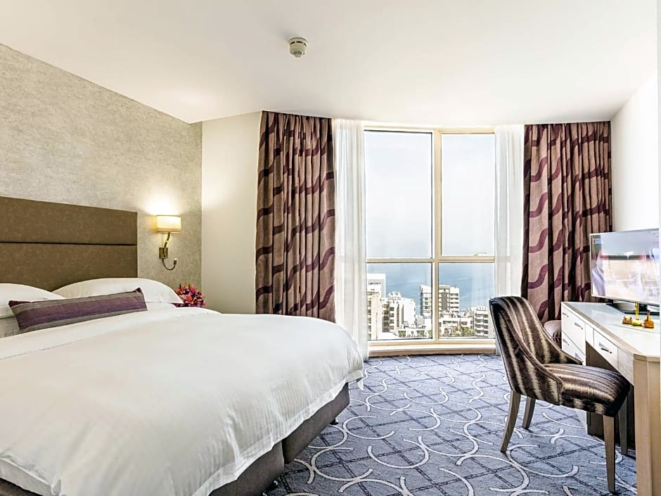 The 35 sqm king sized Club Floor bedroom is facing the gentle blue waves of the Mediterranean Sea. During the whole stay, it grants access to the Club Lounge and offers 24 hours stay, complimentary airport pick up or drop off, 3 complimentary premium beverages at Moodz Lounge and Bar during happy hours, daily refreshment at the Club Lounge from 10:30 until 18:00 & 2 pieces of laundry per day.