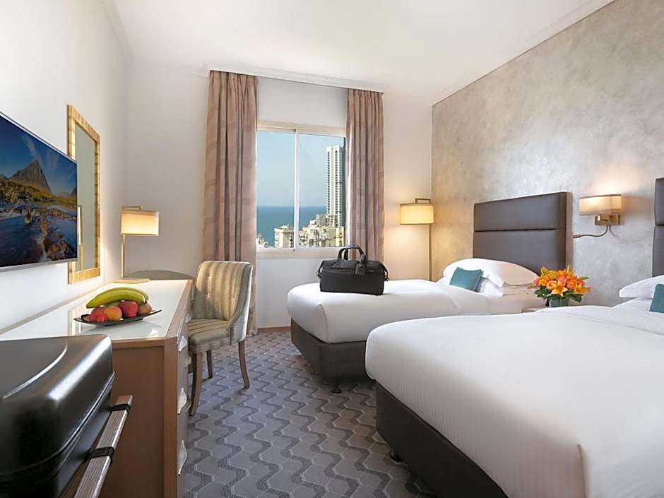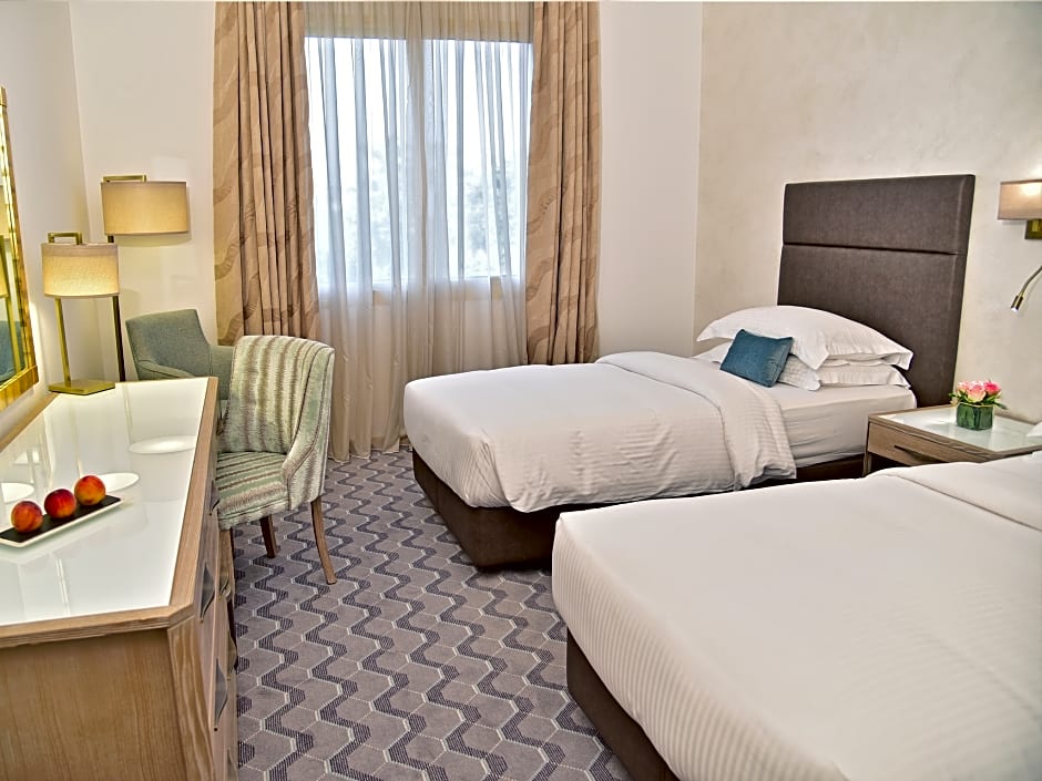 The 35 sqm twin sized bedroom comes with a cool Mediterranean view. For the whole stay guests will have an access to the Club Lounge and will benefit from 24 hours stay, complimentary airport pick up or drop off, daily refreshment at the Club Lounge from 10:30 until 18:00, 3 complimentary premium beverages at Moodz Lounge and Bar during happy hours & 2 pieces of laundry per day.